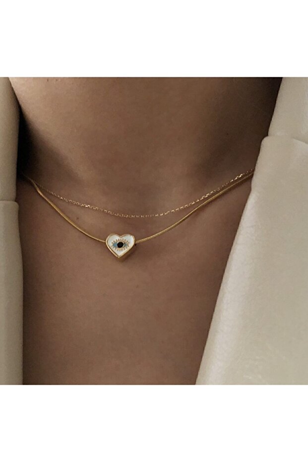OK ROSES Çelik Zincirli Göz Desenli Beyaz Kalp Kolye
